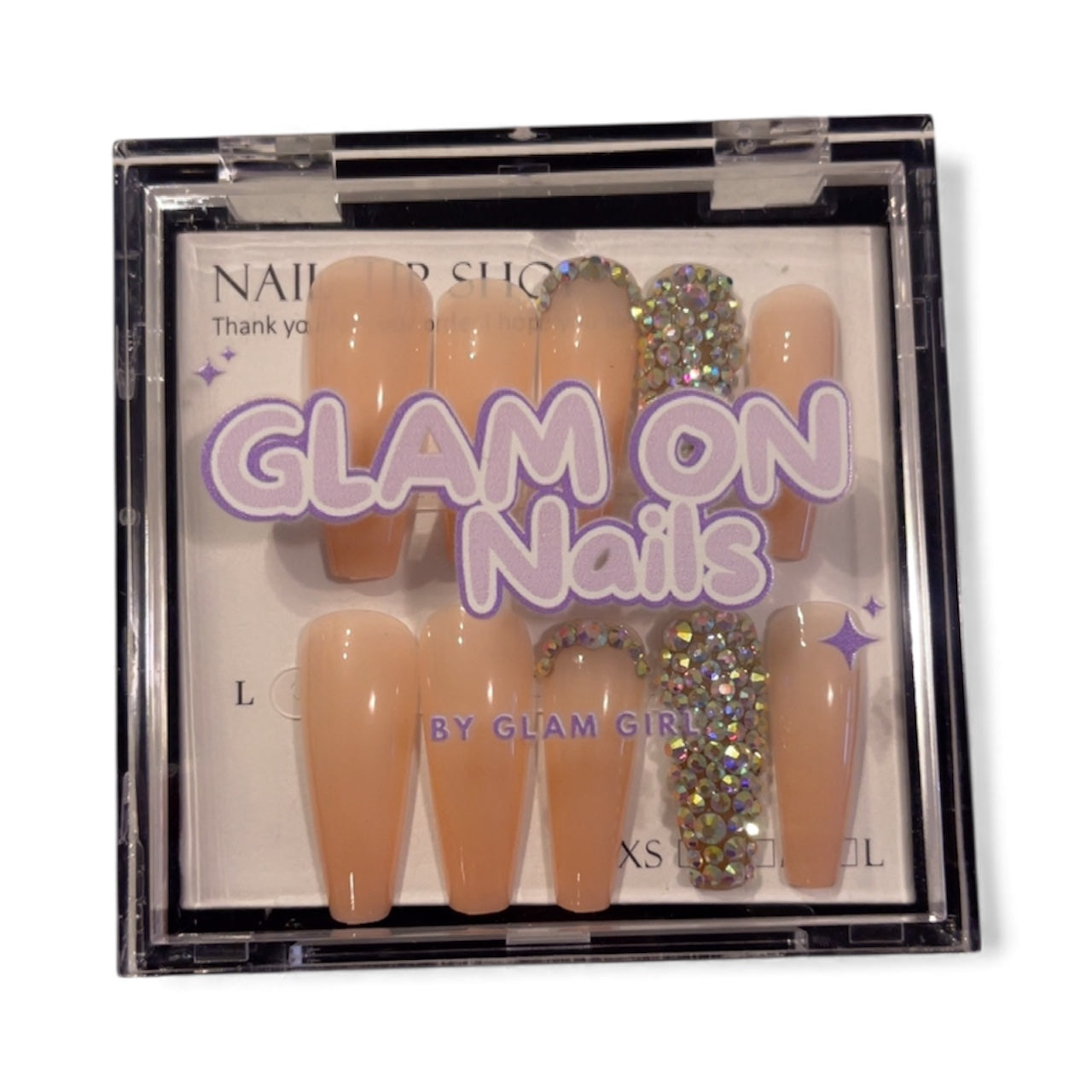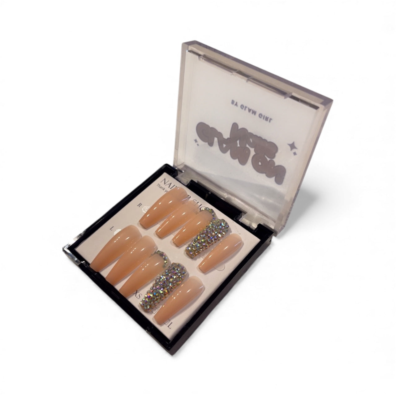 Make a statement with these show-stopping press-on nails that bring the glitz in seconds. Designed with an elegant nude finish and one nail completely bedazzled in diamonds for that head-turning sparkle, and another with a chic diamond pattern for balanced allure. Simply apply and watch the compliments roll in—no salon appointment required. Perfect for  holiday celebrations, special occasions, or whenever you want your nails to steal the spotlight. Bedazzled is your shortcut to looking polished, glamorous, and absolutely unforgettable.