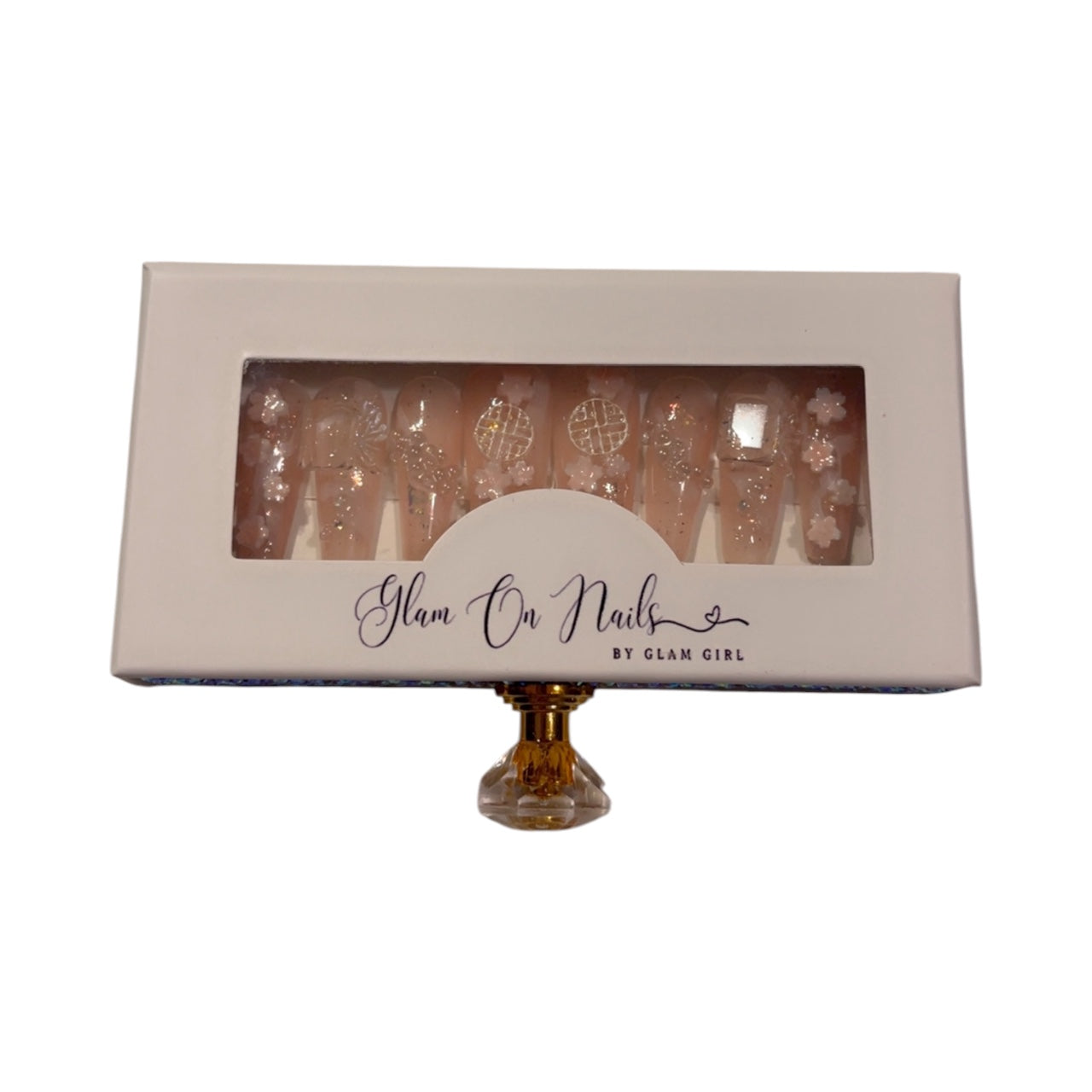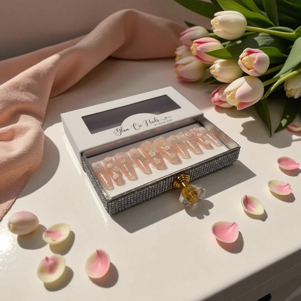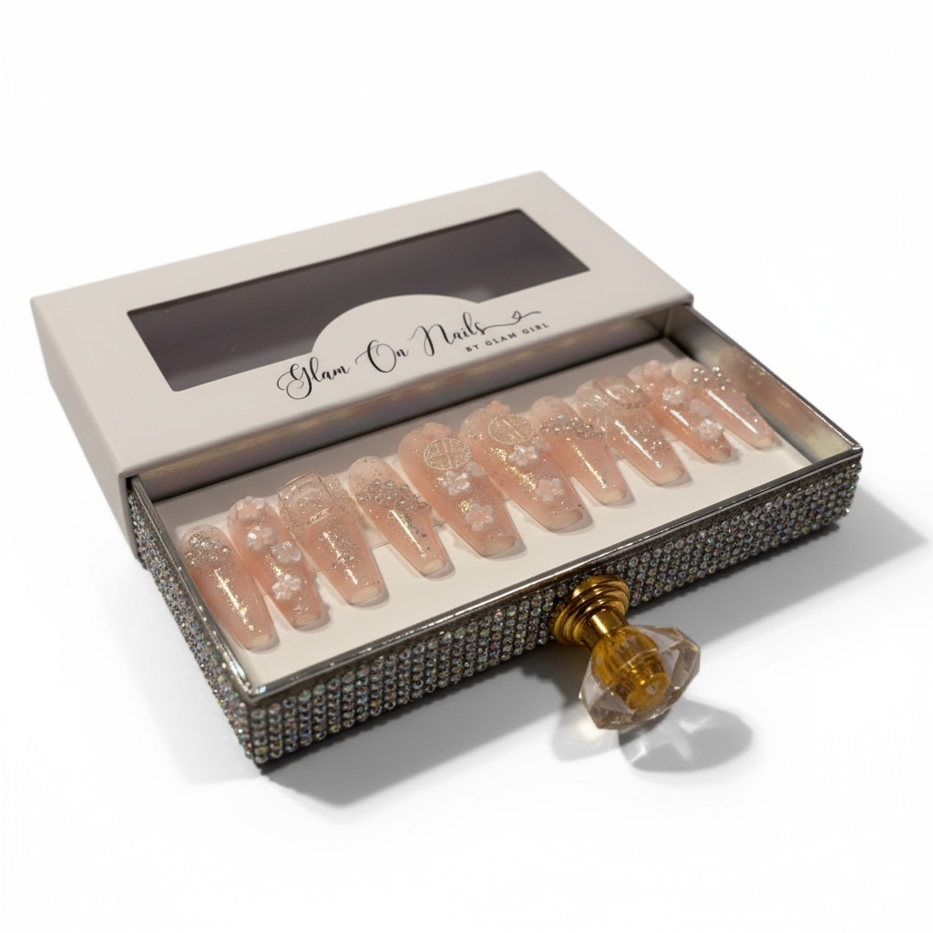 Bring playful energy and artistic flair to your fingertips. Handcrafted with meticulous detail, each nail features vibrant Asian-inspired florals, sparkling diamonds, and dazzling shimmer that catches light from every angle. Channel your inner Harajuku girl with these beauties that deliver personality and pizzazz. Get ready to turn heads with nails that are as fun and fabulous as you are.