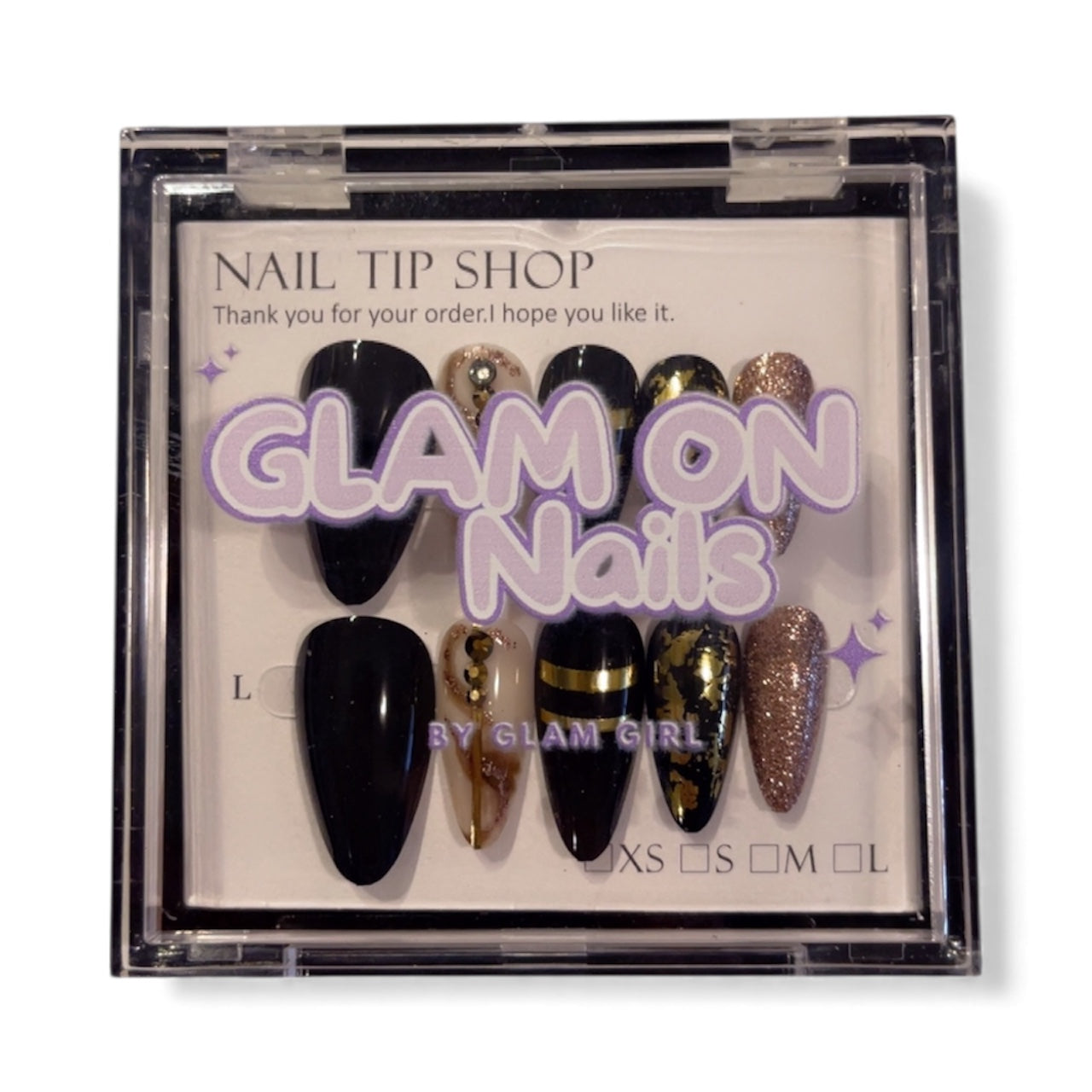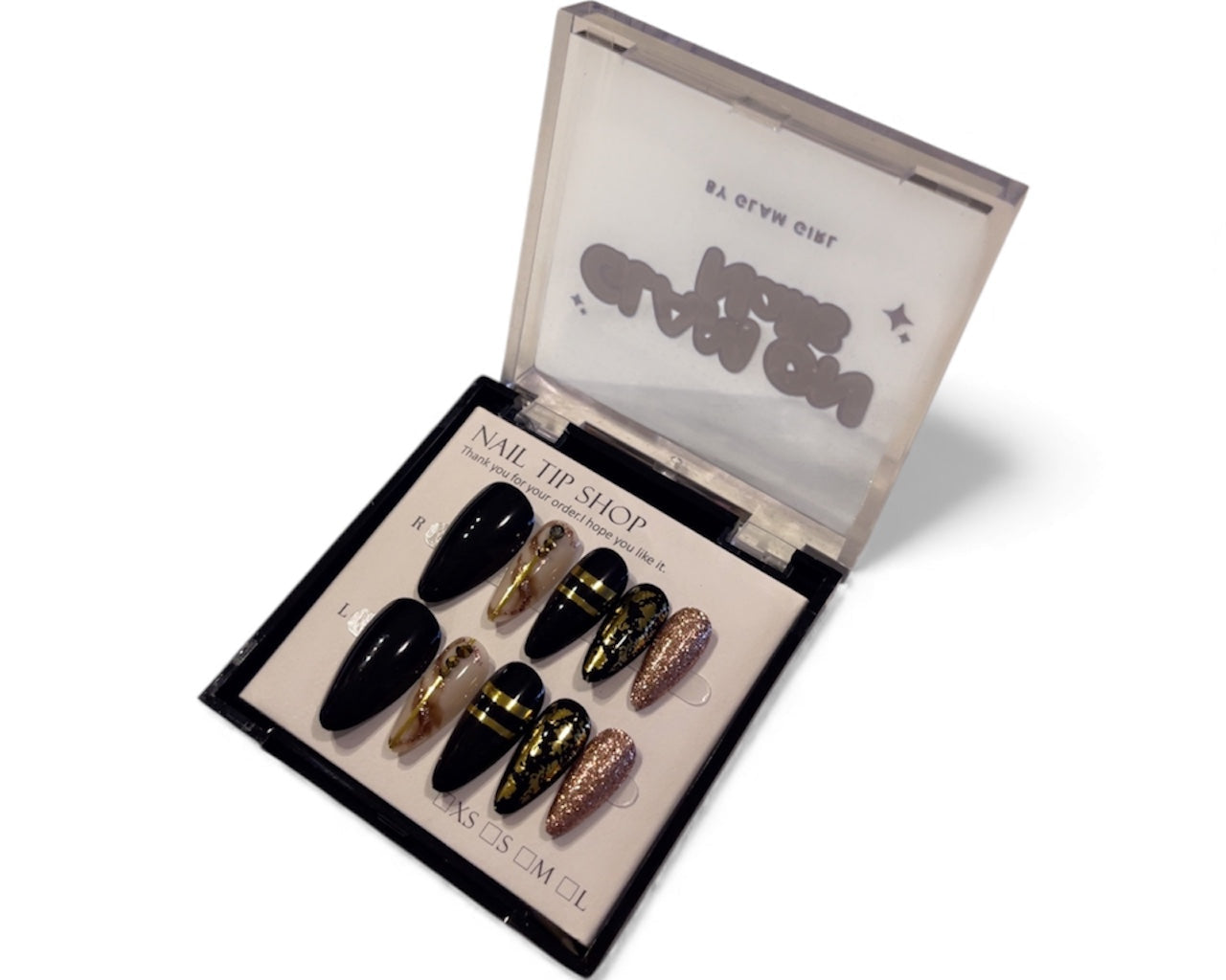 Make a fearless statement with these daring press-on nails that refuse to blend in. Crafted with a striking combination of sleek black, mesmerizing marble patterns, and eye-catching shimmer, diamonds and gold details that elevate every look. Bold, unapologetic, and undeniably luxe, they're designed for those who aren't afraid to push boundaries and demand attention. Transform your fingertips into a work of art that screams confidence and style.