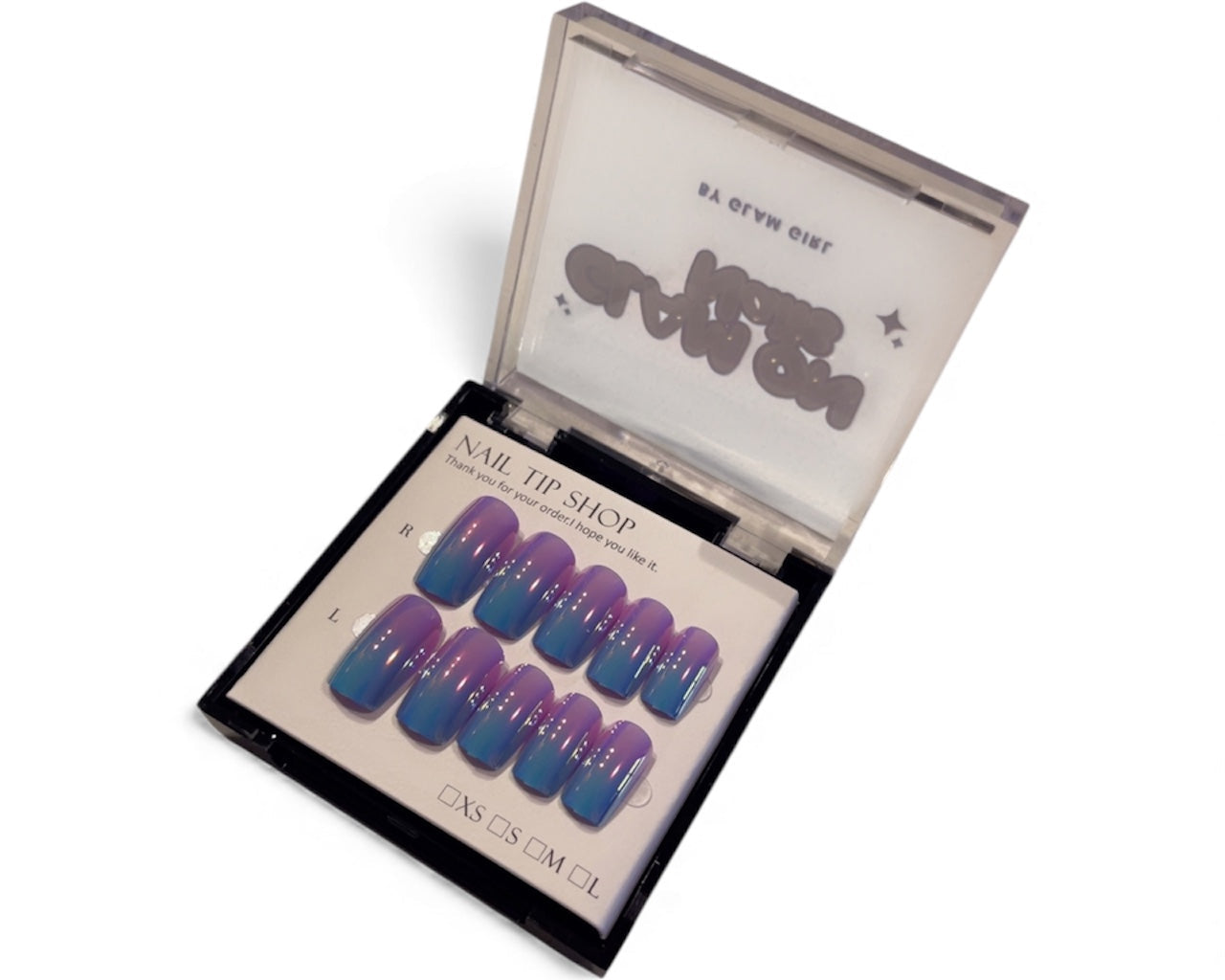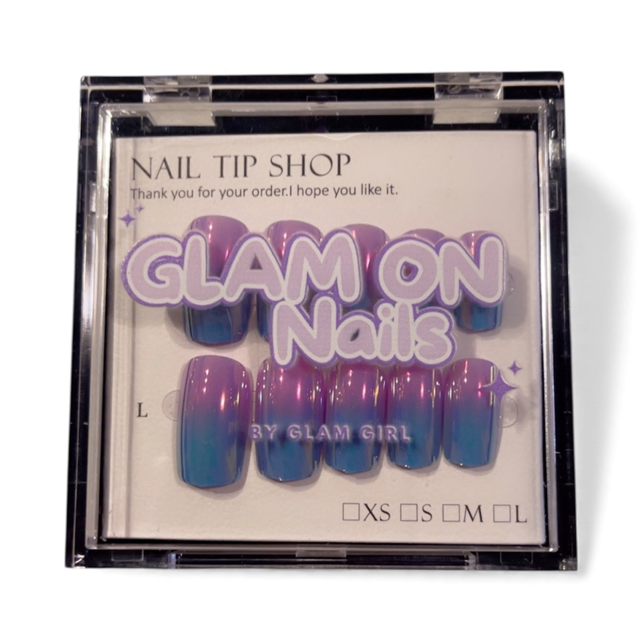 Transform your fingertips into a bold statement with these chrome press-on nails featuring a mesmerizing blue-to-purple ombre gradient. The reflective chrome finish catches light from every angle, delivering that high-impact, futuristic look that demands attention. Whether you're going for edgy glamour or avant-garde sophistication, these nails deliver the confidence-boosting drama you're craving. Wear them fearlessly.